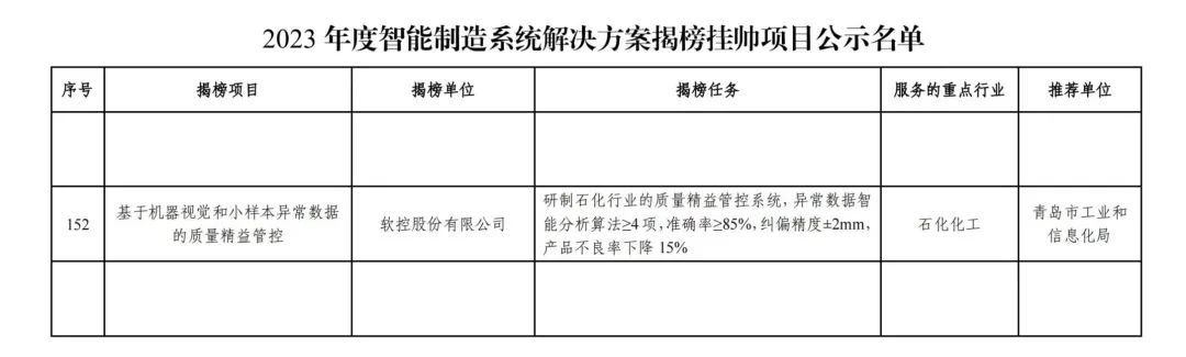 近日,軟控股份有限公司的“基于機器視覺和小樣本異常數據的質量精益管控”成功入選國家工信部“2023年度智能制造系統解決方案揭榜掛帥項目”。