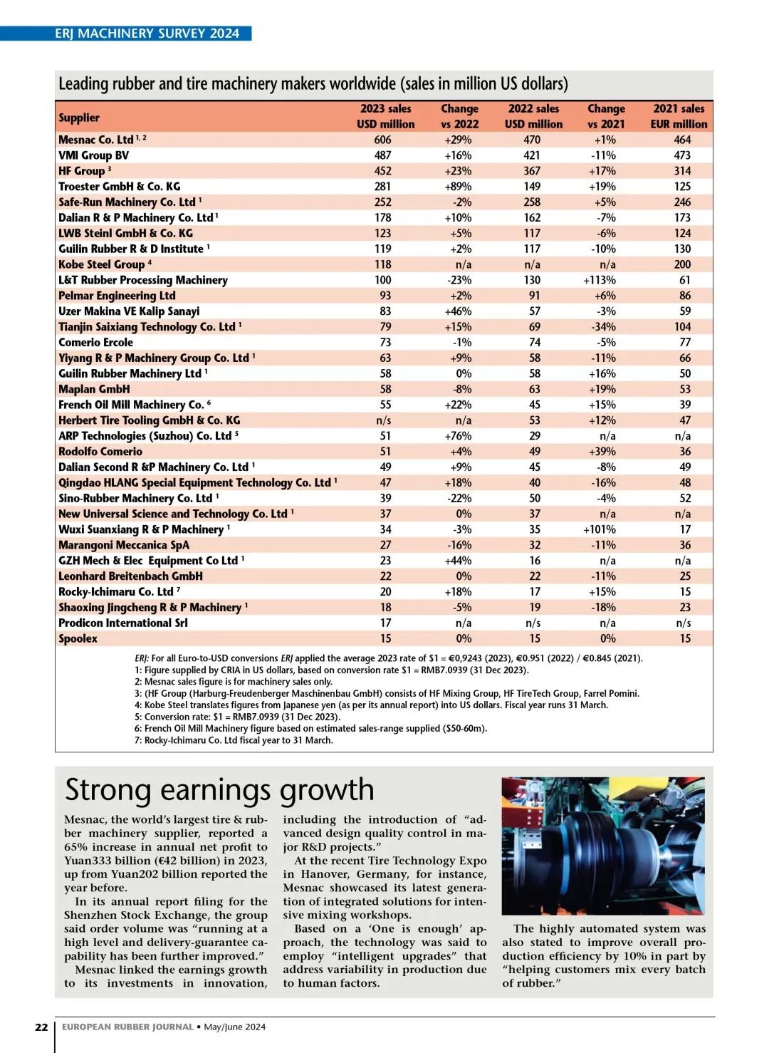 在最新出版的歐洲橡膠雜志(European Rubber Journal) 5/6月刊,公布了2023年全球橡膠機械行業企業的銷售收入排名,軟控(MESNAC)蟬聯榜首。