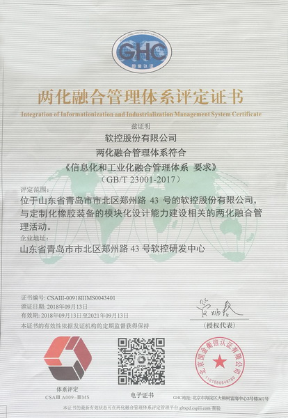 自2017年11月啟動軟控兩化融合管理體系貫標項目以來,公司嚴格按照《信息化和工業化融合管理體系要求》(GBT 23001-2017)及《信息化和工業化融合管理體系實施指南》(GB/T 23002-2017)要求,相繼編制完成了兩化融合管理手冊、體系文件和兩化融合中長期規劃等,成功實施了本次評審的“定制化橡膠裝備的模塊化設計能力”項目,建立了符合要求的兩化融合管理體系。