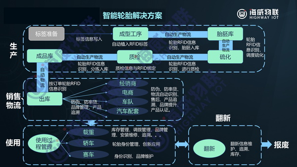 海威物聯以智能終端、智能軟件、智能系統為基礎,提供輪胎車間級數據管理追溯整體解決方案;提供輪胎用RFID整體解決方案,實現輪胎從生產、倉儲物流、銷售、使用、翻新到循環利用的全生命周期追溯和管理。
