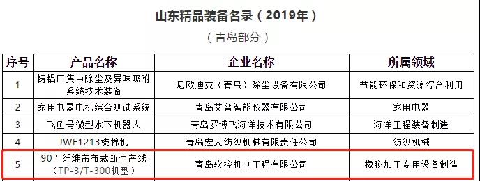 近日,山東省工業和信息化廳發布了《山東精品裝備名錄(2019年)》,軟控90°纖維簾布裁斷生產線(TP-3/T-300機型)成功入選“山東精品裝備”行列。