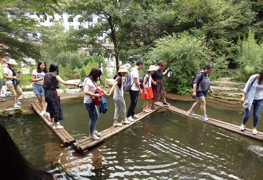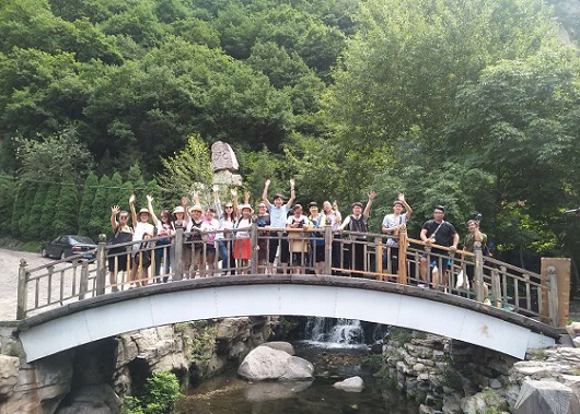 到達景區后,在導游的帶領下我們乘坐“小交通”一路上行,首先來到了綿山景點的第二站——云峰寺,之后去了水濤溝和一線天。在一線天陡峭的懸崖上有十余架天梯蜿蜒而上,而在我們的腳下是淙淙溪流。在這一路上,盛大美璃團隊表現出了他們團結互助的一面,主管白楊一路殿后生怕落下一個人,有些姑娘們不敢往前,大家就給以鼓勵,予以幫助,在這尖叫連連聲中到達了一線天的頂峰。這是整個游覽中最驚險,最刺激的一個環節,也是最考驗人的一個環節,雖然艱險,但是盛大鋼構的每位成員都表現出了不怕困難、勇往直前的不服輸的精神。